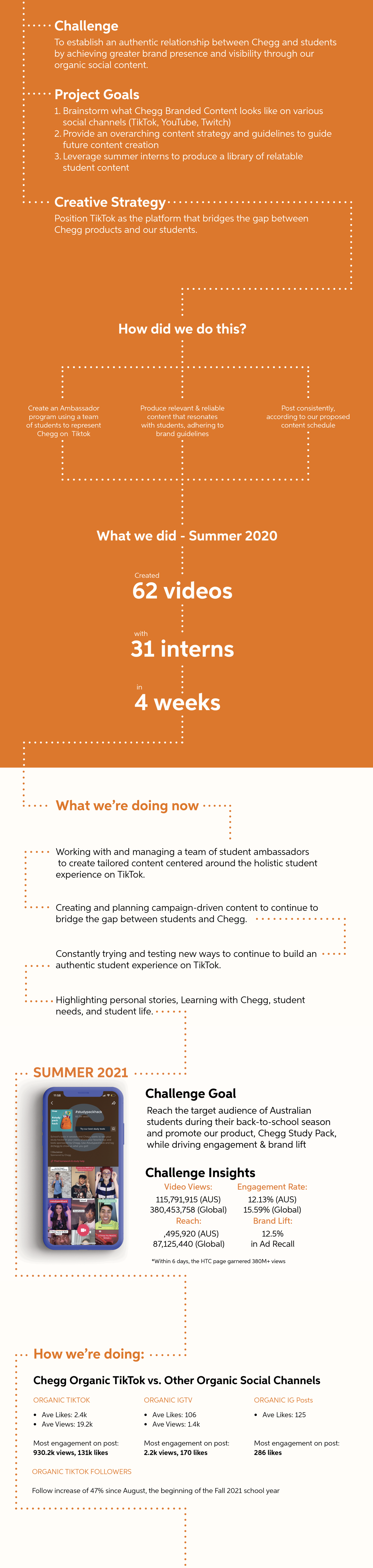 Build and grow Chegg’s presence on TikTok and continue to build a relationship between Chegg and students.